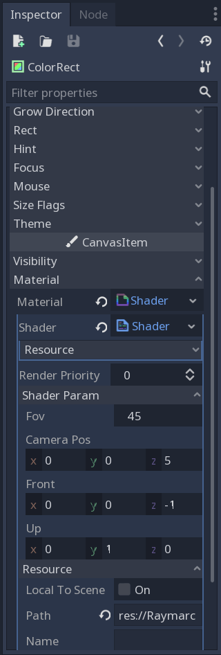 Save the scene and name it Raymarcher.tscn. Run the project (right top corner or press F5). Select Raymarcher.tscn as a main Scene. If you see a red rectangle like on the image above – you have done well!